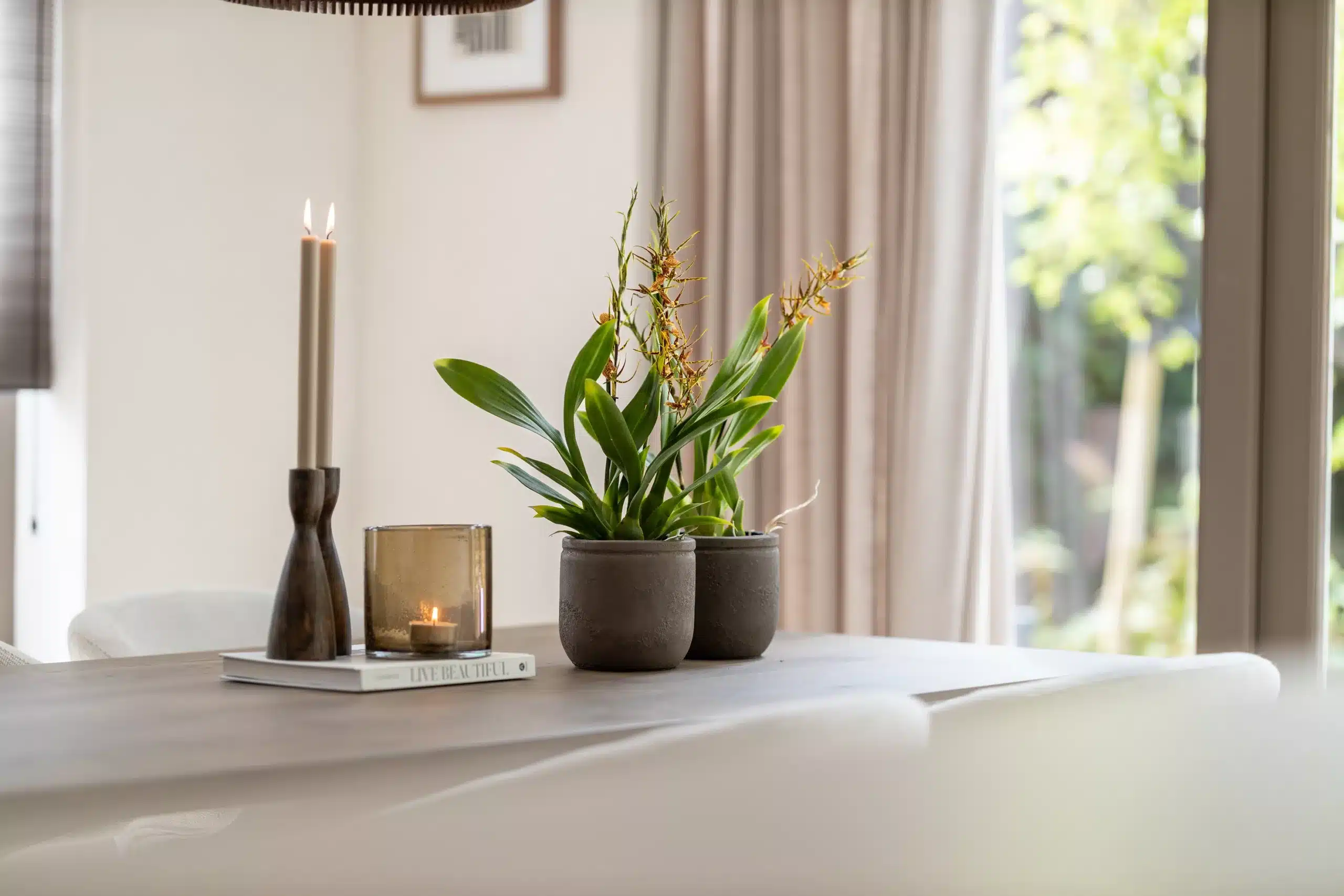 Creeer blikvangers op centrale plekken zoals een eettafel of salontafel. Vul ze met seizoensgebonden bloemen of groen om een frisse uitstraling te creëren die past bij de omgeving.